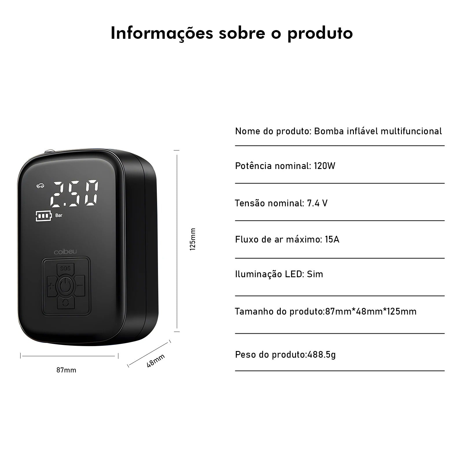 Potência nominal de 120W com fluxo de ar de até 15A — infla rapidamente pneus de carro, bicicleta, bolas, infláveis e mais. -
