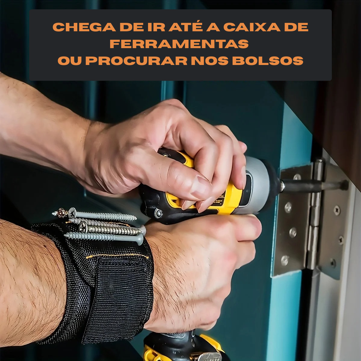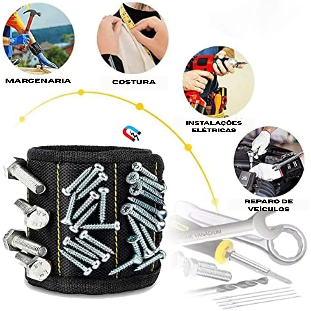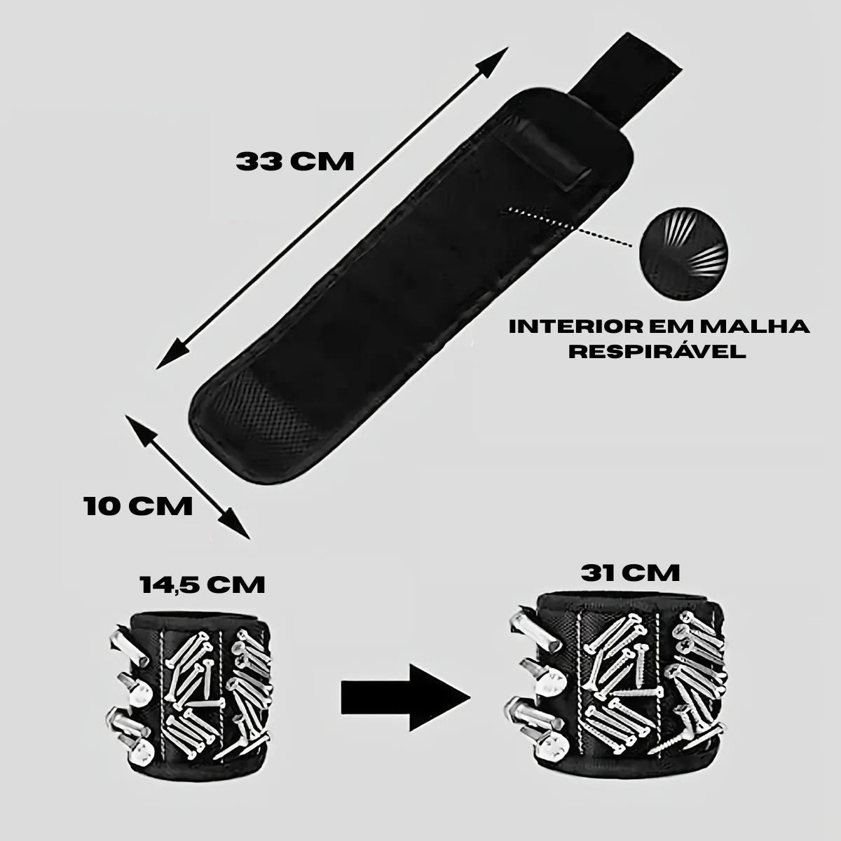A Pulseira Magnética mantém parafusos, pregos, brocas e pequenas peças metálicas presos com firmeza, exatamente onde você precisa: na sua mão, o tempo todo.